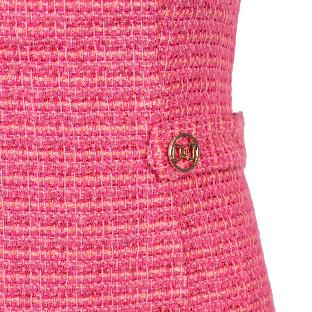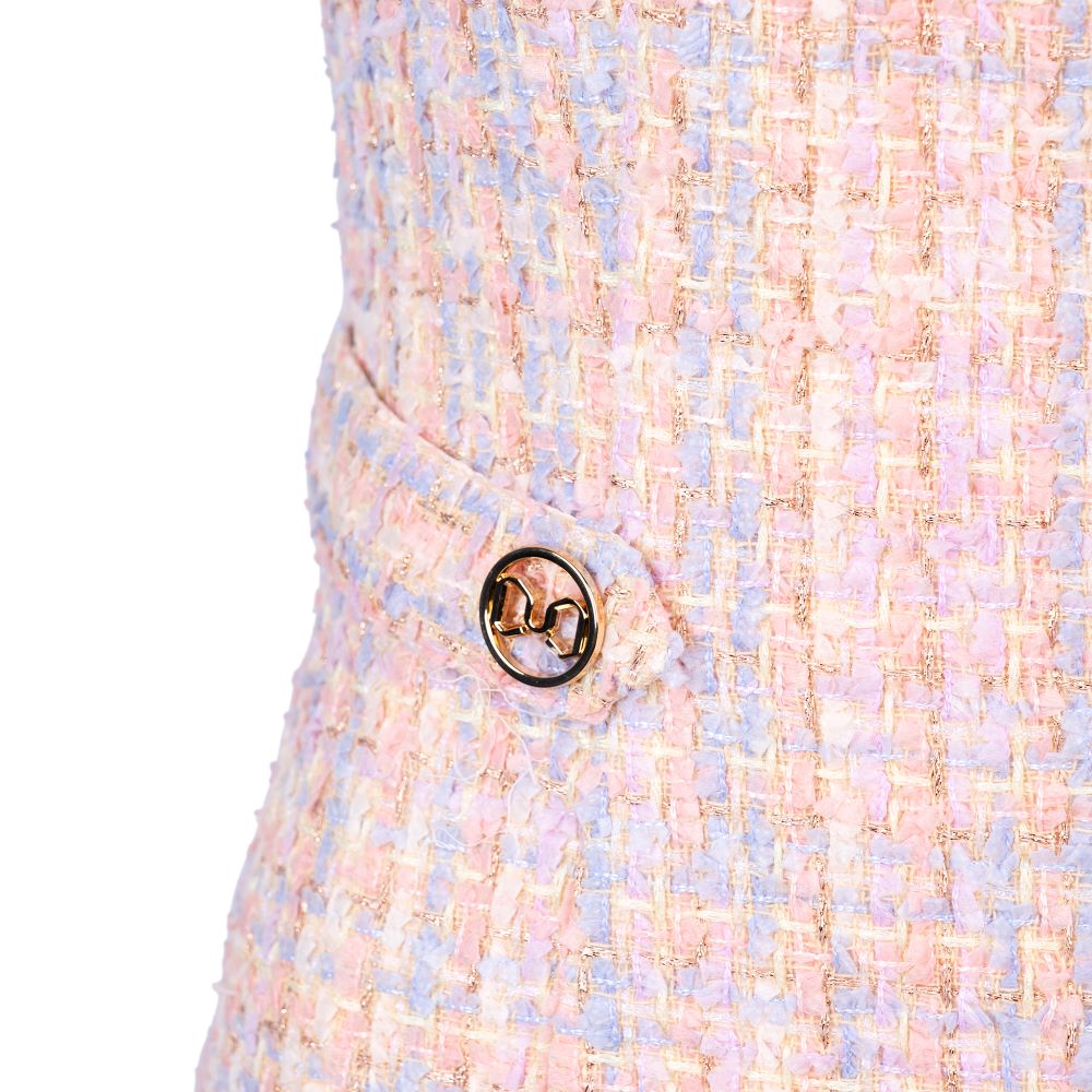 Thiết kế đầm Adele Dress là sự kết hợp tinh tế của vải Tweed cao cấp hai 2 màu chủ đạo màu pastel đan xen sợi hồng, tím, vàng và màu hồng dâu đậm. Thiết kế Cut - out phần ngực trên mới lạ, trendy khiến cho thiết kế thêm phần sinh động và tạo nét đột phá hơn trong phong cách thiết kế từ Juteam. Kết hợp đính cúc ở phần thắt eo tạo cảm giác thiết kế trong thon thả hơn khi mặc, điểm nhấn cúc vàng cũng là điểm cộng cho thiết kế adele dress trở nên mới lạ hơn.